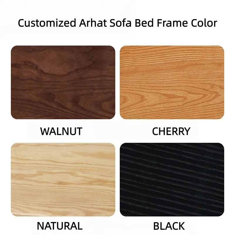 - ✔Shipping Included: Arhat bed frame(pre-assembled), back support and armrests. Pillows and back cushions and seat cushions and end table. Arhat sofa bed frame color is customized(walnut/cherry/natural/black are available, leave a note at the checkout page for your frame color). Delivered on a wooden box pallet.