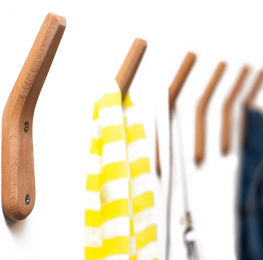 Each hook peg is made from the highest quality solid heavy duty beech wood with a natural wood color. Our pegs are 6 inches in length, 5 inches deep and 1.5 inches wide. Each box contains 2 pcs and can be used for a variety of items including, heavy coats, hats, scarves, handbags, jackets, headphones, backpacks, baseball caps, winter coats, kitchen towels and other clothing and kitchen accessories. Each hook can handle a weight of up to 5 pounds.